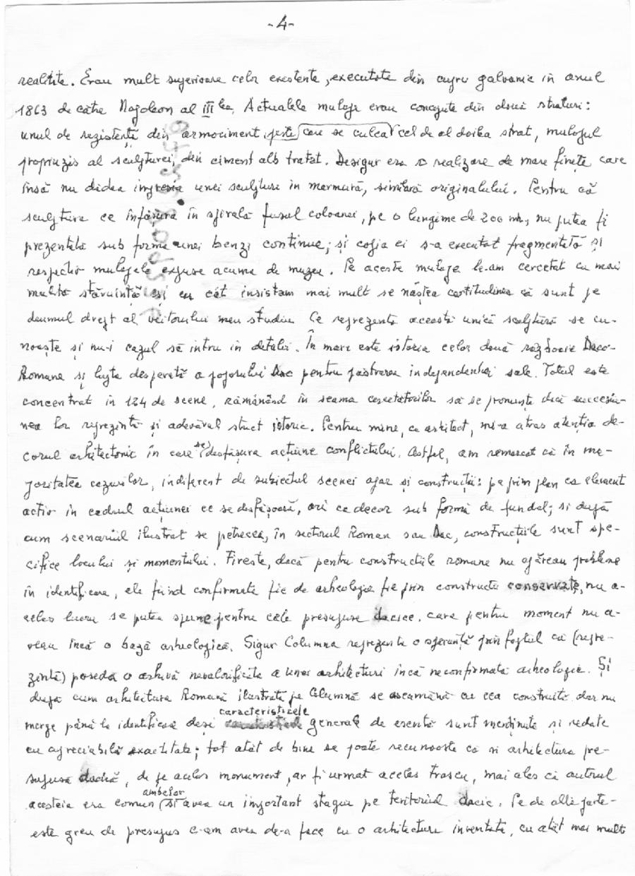 Unii dintre d-voastră poate ştiu, cei mai mulţi însă nu, că arhitectul Dinu Antonescu a făcut parte din echipa care a supravegheat lucrările mulajelor executate după Columnă la Roma. Cum a realizat studiul despre Columnă şi cum i-a fost recunoscută munca, e mai bine să ne spună autorul: „Fără să cunosc prea bine timpurile ce au urmat, am concurat şi cîstigat o bursă pe durata de doi ani la Şcoala română din Roma. În total eram 12 bursieri, absolvenţi a diverse facultăti din ţară/ Obligatoriu, fiecare bursier era dator să propună un subiect de lucru, care odată aprobat trebuia să fie studiat, încheiat şi redat la sfîrsitul celor doi ani de bursă. Lucrarea se preda apoi la Academia Română sub patronajul căreia funcţiona şi Şcoala romănă din Roma ... În grădinile Vaticanului alăturate muzeului erau expuse mulajele executate după reliefurile sculptate, aflate pe fusul Columnei lui Traian. Erau realizate în anul 1934 sub pontificatul papei Pius al XI-lea. Din punct de vedere tehnic mulajele reprezentau tot ce se putea realiza mai perfecţionat şi mai apropiat de realitate. Erau mult superioare celor existente executate din cupru galvanic in anul 1863 de către Napoleon al III-lea. ...Desigur era o lucrare de mare fineţe care însă nu dadea impresia unei sculpturi în marmură, similară originalului....Aceste mulaje le-am cercetat cu mai multă stăruinţă şi cu cît insistam se năştea certitudinea că sunt pe drumul drept al viitorului meu studiu. ...Pentru mine, ca arhitect, mi-a atras atenţia decorul arhitectonic în care se desfăşura acţiunea conflictului. ...Fireşte, dacă pentru construcţiile romane nu apăreau probleme în identificare ele fiind confirmate fie de arheologie, fie prin construcţii conservate, nu acelaşi lucru se putea spune despre cele presupuse dacice, care pentru moment nu aveau încă o bază arheologică. Sigur, Coloana reprezenta o speranţă, prin faptul că era o adevărată arhivă, nevalorificată, a unor arhitecturi încă neconfirmate arheologic...Era iarăşi limpede că din punct de vedere arheologic, tot ce se întreprinsese pe teritoriul ţării noastre şi în special în Transilvania de cercetători romăni între cele două războaie modiale era, era numai un prim pas. De aceea dezvăluirile Columnei Traianee, în special cele privind presupusa arhitectură dacică, le-am considerat atunci ca un nou pas de deosebit interes atit pentru arheologi cît şi pentru istoria arhitecturii din Romania. Drept urmare, mi-am concentrat, în următorii ani, studiul în exclusivitate pe această problemă. La sfîrsitul celor doi ani de bursă am considerat că pot preda ca lucrare finită numai capitolul arhitecturii romane şi în special cel al arhitecturii militare; capitolul arhtecturii presupuse dacice, din lipsa unei documentaţii arheologice, urma să fie încheiat atunci cînd studiile de teren vor fi, din punct de vedere al cercetării, mai intense". Întrerup o clipă relatarea pentru a va spune că, aşa parţial cum era, studiul lui Dinu Antonescu, - text şi planuri - a fost prezentat la Bienala Şcolii Române din Roma; ecourile în presa italiană au fost cu totul remarcabile, arhitectul romăn a fost elogiat de presa italiană pentru aceasta lucrare, considerată a fi - prin noutatea subiectului - un aport important pentru istoria arhitecturii şi pentru arheologie.
