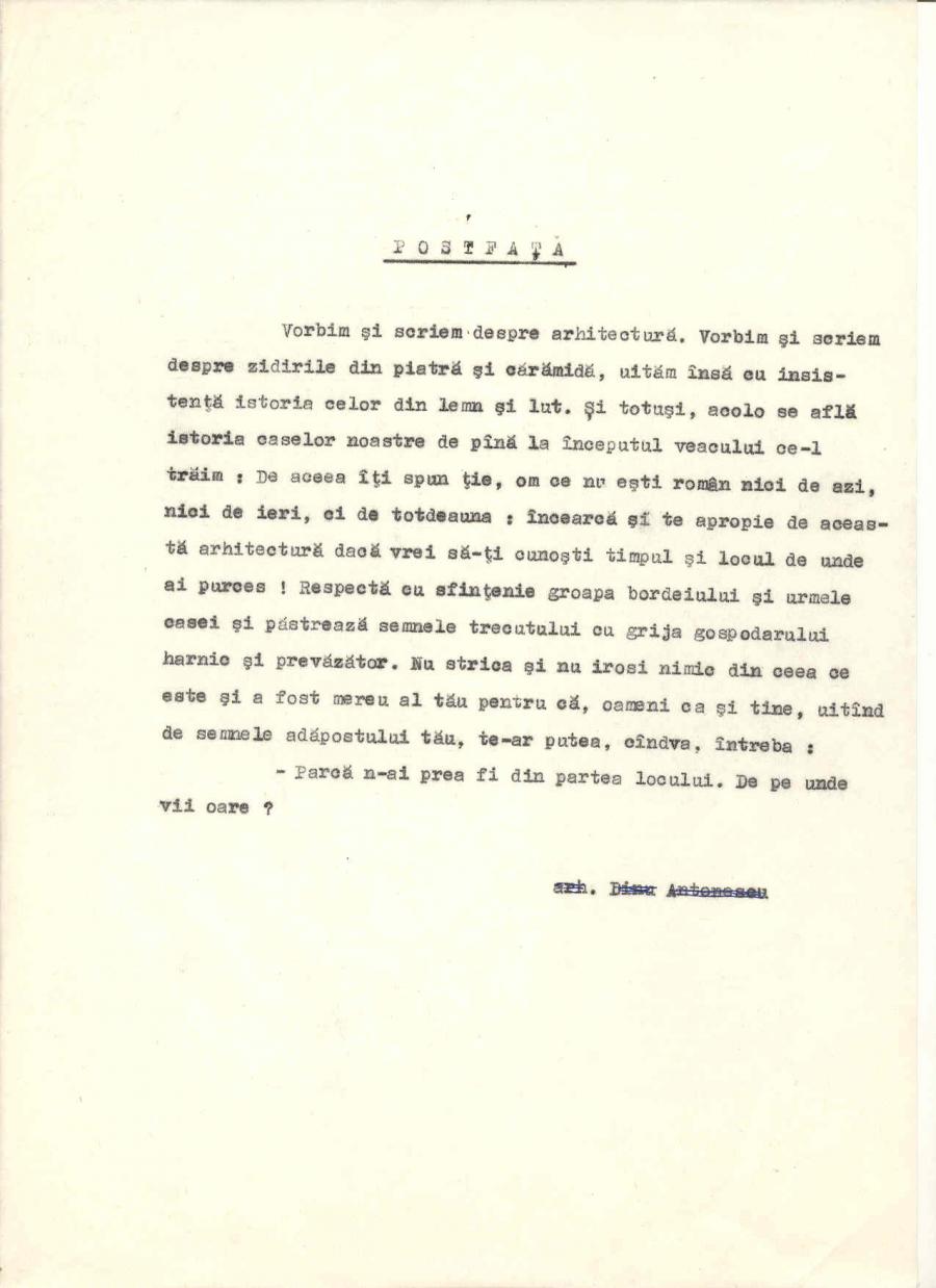 Dinu Antonescu şi-a încheiat studiul despre arhitectura refugiată pe friza Columnei. Este singura lucrare în care se abordează exhaustiv această temă. Nimeni nu s-a arătat interesat să editeze în România aceasta carte. Mărturisesc că şi eu fac parte dintre cei vinovaţi . Înainte cu peste aproape doi ani de la stingerea din viaţă a celui pe care am încercat să-l evoc în faţa d-voastra, i-am promis că voi găsi posibilitatea editarii ei, fiind convinsă că Uniunea arhitectilor - înzestrată acum cu o editură proprie - s-ar simţi onorată să o facă. Am fost lipsită de imaginaţie şi total ineficientă. Drumul pe care l-am ales pentru a-mi îndeplini promisiunea s-a arătat a fi unul înfundat, în pofida asigurarilor primite o vreme din partea celor care afirmaseră ca vor face tot posibilul să o editeze.